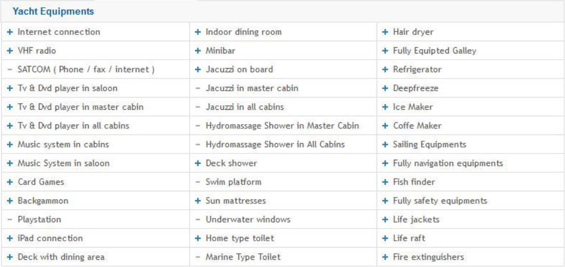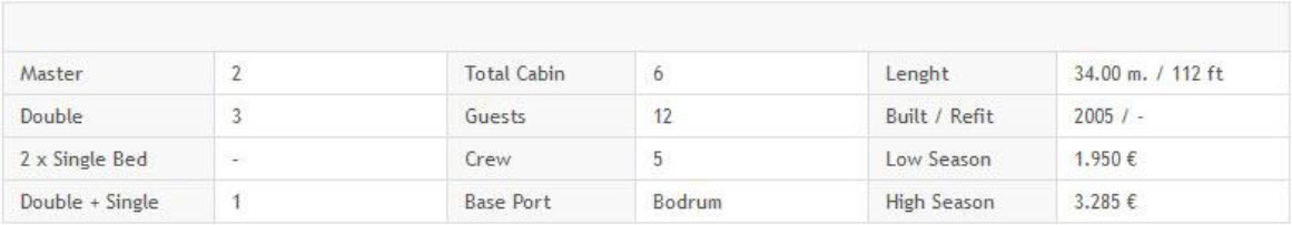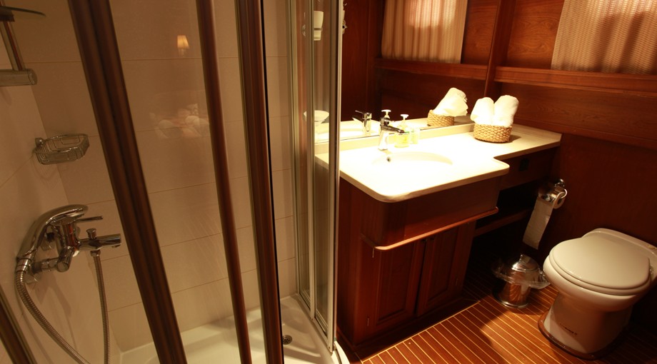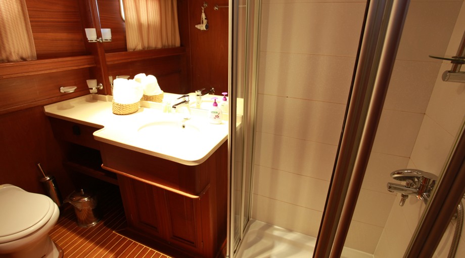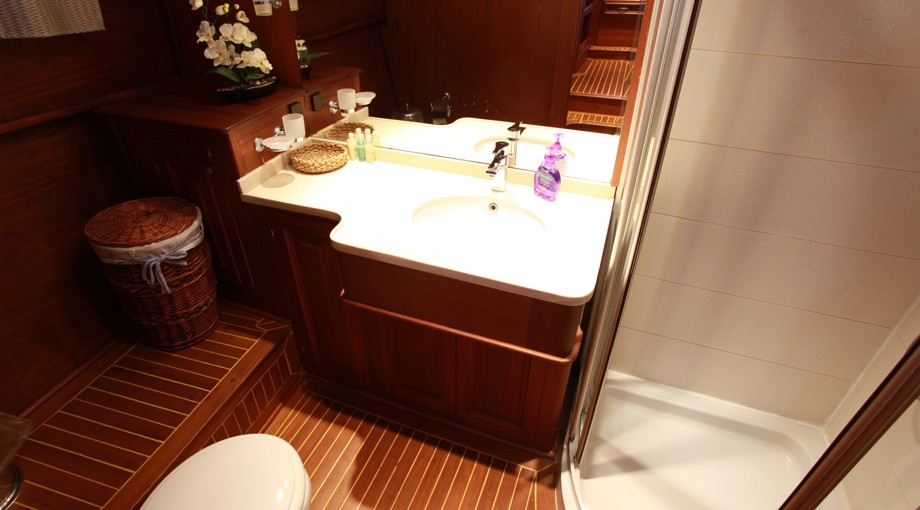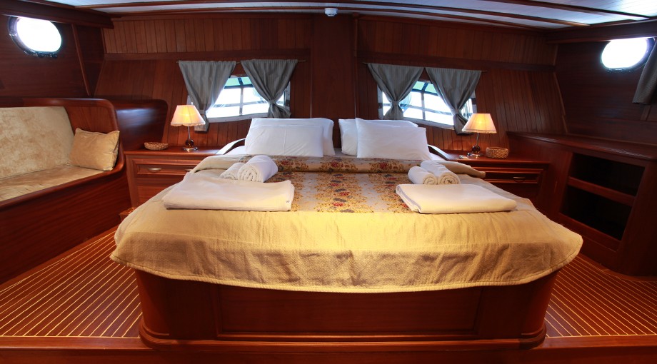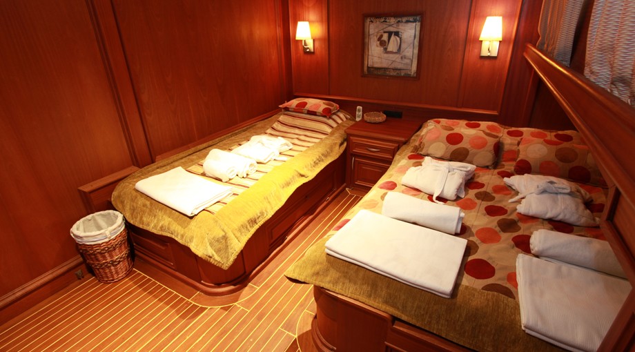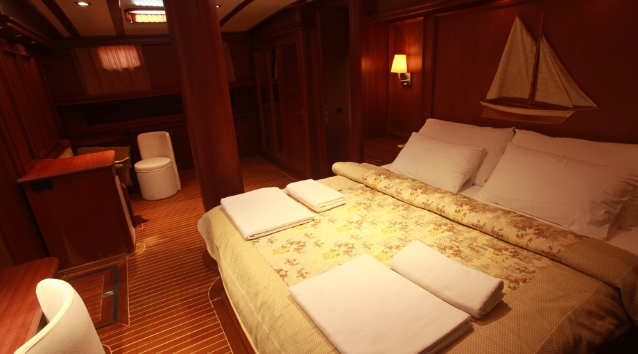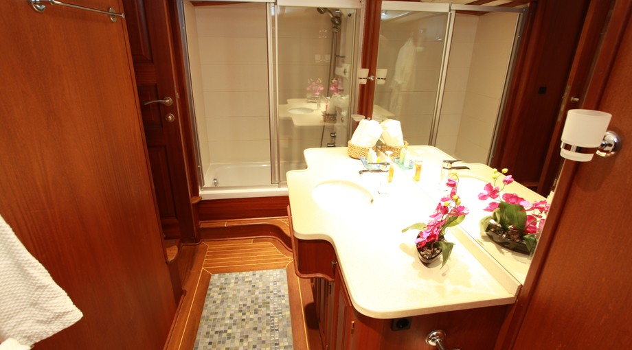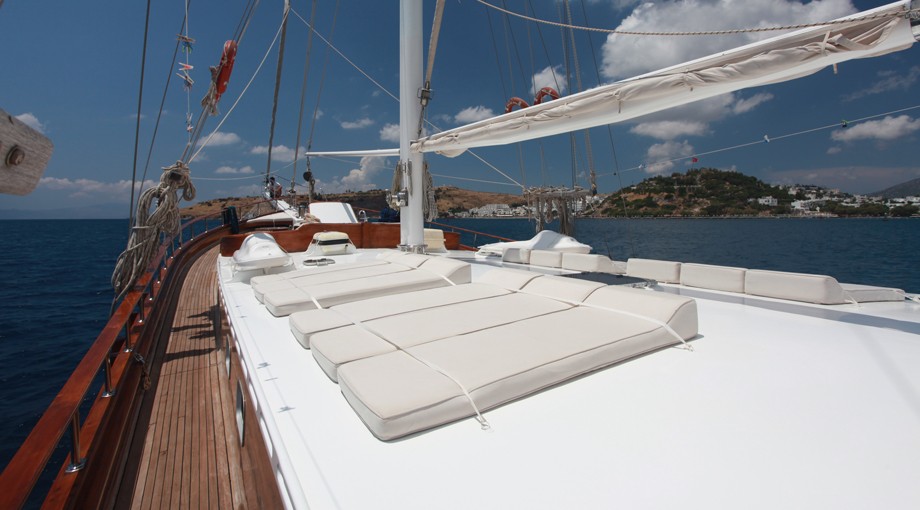 Expansive white cushions for sunbathing and relaxing are spread around the decks. On the fore deck there's a Jacuzzi tub for relaxing and cooling off.She offers spacious accommodation for up to 12 guests in two master cabins, three double bed cabins and one double bed + single bed cabin.The cabins