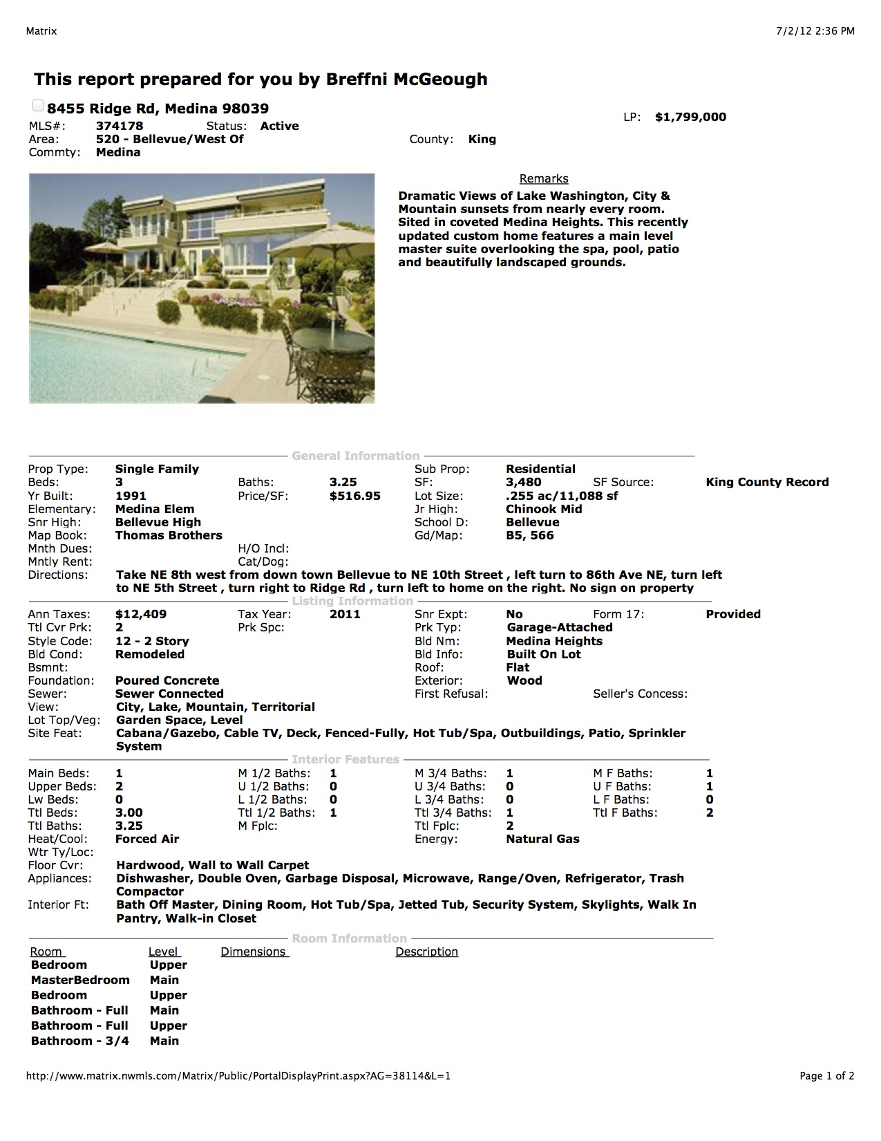 Type: Â Â Â Residential Bedrooms: Â Â Â 3 Bathrooms: Â Â Â 3.25 Square Footage: Â Â Â 3,480 Year Built: Â Â Â 1991Taxes: Â Â Â $12,409 Neighborhood: Â Â Â Medina Request A Showing, Contact Breffni McGeough 425-260-0440 Please click on the printable image below for additional details | |